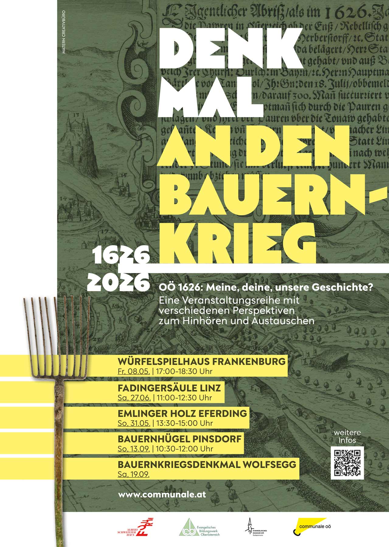 Unter dieser Leitfrage lädt unsere Veranstaltungsreihe im Rahmen der communale oö 2026 dazu ein, die vielschichtigen Deutungen des Oberösterreichischen Bauernkriegs von 1626 miteinander ins Gespräch zu bringen – offen, kontrovers und im respektvollen Zuhören. An ausgewählten Bauernkriegsdenkmälern wollen wir unsere sozialen Blasen hinter uns lassen, zusammenkommen und gemeinsam neue Wege der Erinnerungskultur erproben.