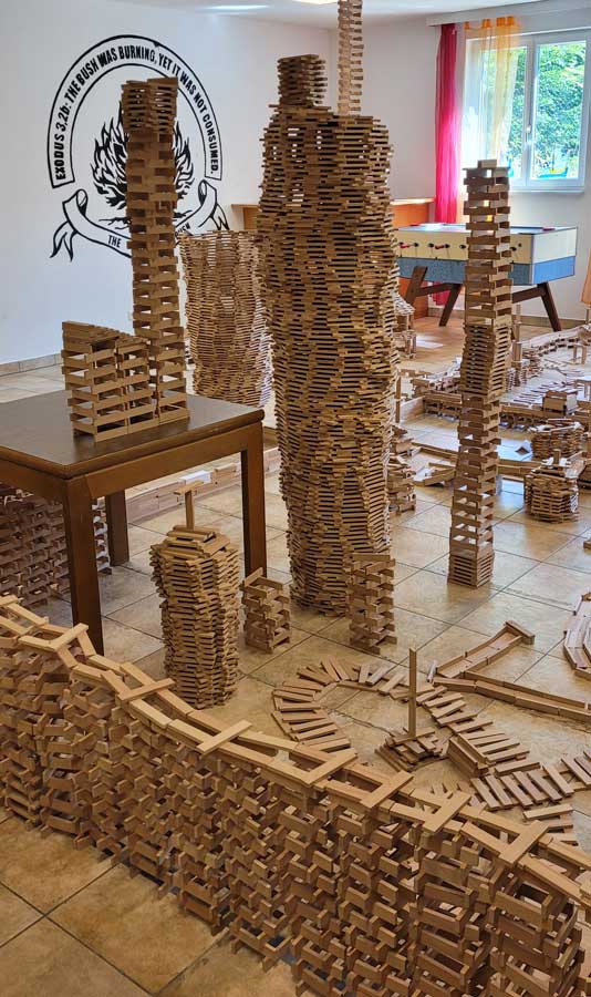 Wir haben für bis zu 40 Kinder und Jugendliche Platz, die gemeinsam von Freitag bis Samstagabend bis zu 64000 Holzbausteine verbauen und Sonntag beim Gottesdienst den Besuchern, Eltern, Angehörigen präsentieren. Letztes Jahr verzeichneten wir einen Teilnehmer-Rekord mit nahezu 50 begeisterten Kindern und 15 teils jugendlichen Betreuern. Es war übervoll, aber es wird sehr gerne angenommen, von Eltern und Kindern.