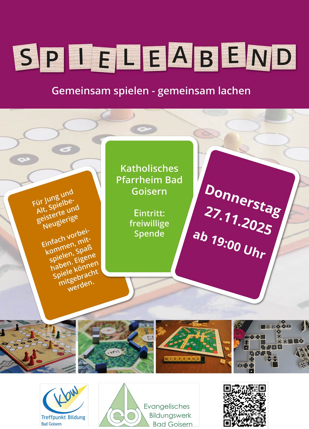 Das Evangelische und das Katholische Bildungswerk Bad Goisern laden herzlich ein zu einem offenen Spieleabend mit Gesellschaftsspielen – für Jung und Alt, Spielbegeisterte und Neugierige!
